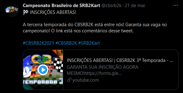 No dia 25 de fevereiro de 2021, SRB2 Racing Brasil informando que estava a procura de editores para os vídeos da competição. Três usuários se ofereceram, e, após a avaliação, Kimo foi escolhido.