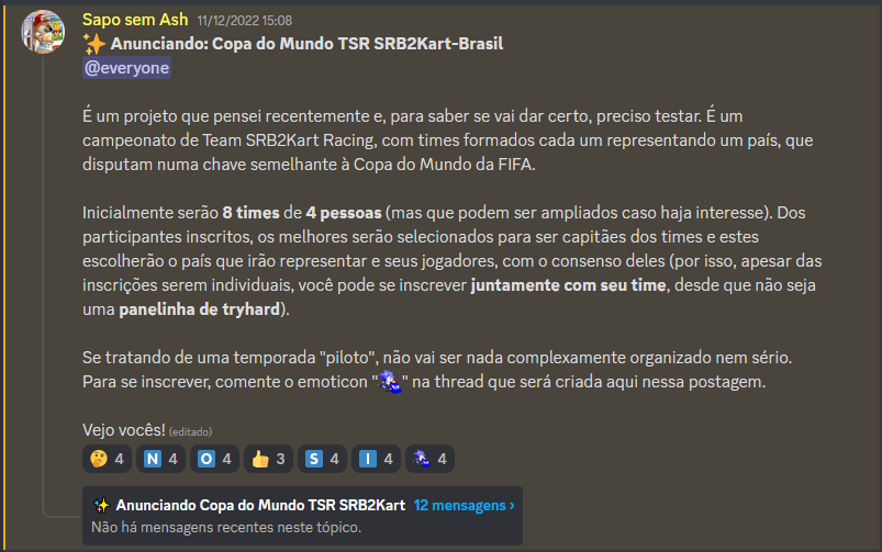 O evento foi anunciado por SRB2 Racing Brasil no Discord, permitindo inscrições por uma semana. O torneio foi cancelado devido a falta de participantes.
